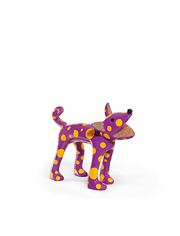 1990年代後,草間彌生曾為博物館、藝術節、博覽會創作戶外雕塑或裝置作品,如知名的南瓜雕塑,以及千禧年後「Hi, Konnichiwa系列」發展出的巨型植物、花朵、女孩、小狗雕塑,作品表面都塗有色彩鮮豔的圓點圖案,風格強烈。此件《圓點小狗》雕塑是2009年倫敦維多利亞‧米羅畫廊花園雕塑展的展品之一,展覽中有一對小狗雕塑,高一點的叫Key-Chan,小一點是Rhu-Chan。Chan在日文的意思有小的、親暱之意。草間彌生會為自己創作的小狗雕塑取名字,「小Key」、「小龍」等可愛的小名,代表著她的童心未泯。《圓點小狗》各有不同的色彩,如同它們的名字,每件小狗雕塑都是獨一無二的作品。