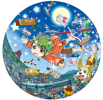 《夜空中飛翔的懷舊童年》以圓形的畫布呼應畫中的滿月,綠髮紅衣的女孩飛翔在佈滿閃亮星星與一輪明月的藍色夜空中,她水汪汪的大眼與粉嫩稚氣的臉龐流露出無比的純真,顯然因為這突來的飛翔而感到驚訝,作為同伴的的小狗與兔子帶著驚訝的神情也高高飄起,牠們都以圓潤可愛的卡漫造形呈現,小兔子更是巧妙地飛到月亮之上。自認為是御宅族,Mr.認為青春正盛、纖弱可愛的純真女孩擁有無比吸引力,同時卻又是可望而不可即的欲望投射,是一種承載著美好理想的想像。《夜空中飛翔的懷舊童年》以綠髮女孩為中心,開展出樂觀面對驚奇、充滿希望的一瞬,女孩伴隨著身旁許多具有特別意義的物件與動物同伴 飛翔在不可思議的夜空,遠離腳底下那繁華的城市。整個作品呈現一個亮晶晶,閃耀著魔法的奇幻時刻,洋溢著無邊的熱情與正向能量,充份傳達了青春、可愛又天真無邪的日式「萌」精神。在充滿殘缺困頓的現實世界,開闢出一方幻想無邊、充滿活力的夢想世界。