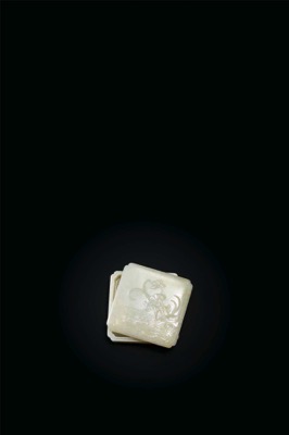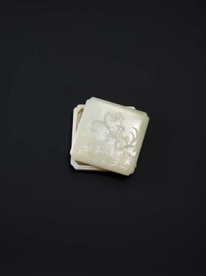 愛。此白玉蓋盒玉質溫潤,玉色瑩潤光潔。器蓋淺浮雕一對鴛鴦,