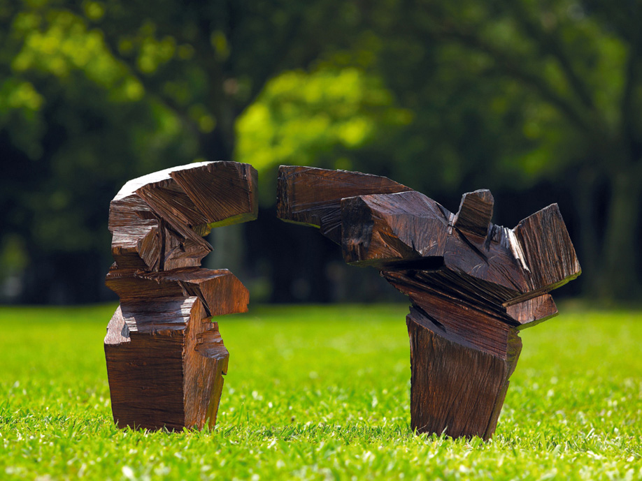 傳神,是朱銘雕塑表現的特質。「太極拱門」可以說是太極系列已臻化境之作,看似拱門其實並非拱門,而是由兩人對招的姿勢演變而來。朱銘將動作簡化到只剩抽象的運動形體,以刀斧劈展現過招時的氣魄與力度,藉此形構成拱門在透空的虛空間中,表現出重量感及速度感。拋開所學的技巧與腦中的形式,反樸歸真,將生命力透過刀斧呈現出來。本次拍品為小型雕塑作品具體而微呈現了朱銘雕塑作品的脈絡精華。觀拱門就知藝術之太極,懂不懂得太極拳,似乎無關宏旨。