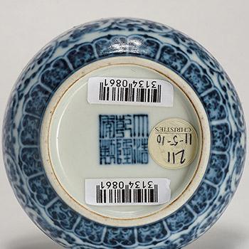 是件青花發色濃愈,紋樣略顯暈散,然釉水滋厚,畫工精細,典雅俊美,仍稱佳器。