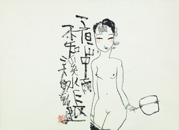 雖然畫中描繪女體,但其筆法樸實,書法線條架構粗獷襯托女 子皮膚嬌嫩,富含拙趣而不俗媚,盡展中國彩墨的韻味。宋代 隨著「文人畫」興起,水墨畫達到高峰,風格日趨多元,此作 在碑帖筆法與構圖呈現方面,與宋朝梁楷、書畫家孫金龍的作 品遙相呼應。