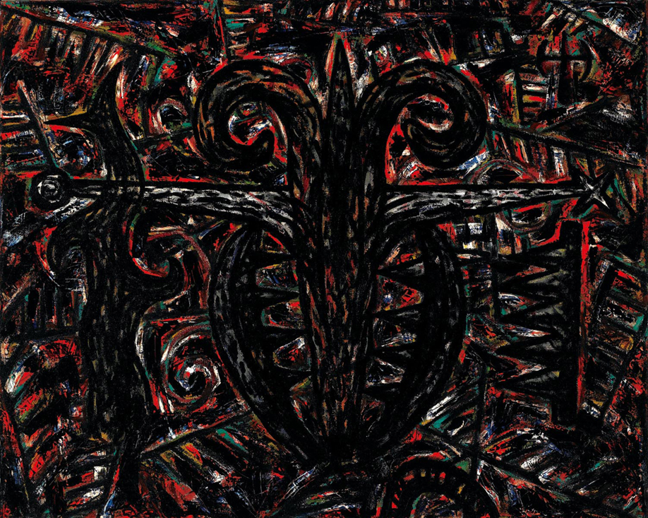 楊仁明「從黑水長出來的新植物」系列,藉由黑水隱喻外在環境與內在心理情境,畫面中的黑水污濁、紛擾,不是隱晦不明,就是強而有力的漩渦狀,構築出渾沌的大空間,將符號擴充為具有個性的個體,頑強的肢體、剛硬的線條,是藝術家回應世界所造之像。一灘黑水所象徵的符號:鋸齒形和渦形等,尖銳地一如往常,在畫面的重心,透過類似工業器具般冷硬的符號,賦予有機的植物形體意象。這樣的表現手法,的確使人如陷迷霧中。讓觀者對於他及作品的想像,或者是作品對於社會的投射,在此系列獲得最大可能的開展、擴張,而這來自於畫面拒絕接受單一抑或論斷式的詮釋語言。