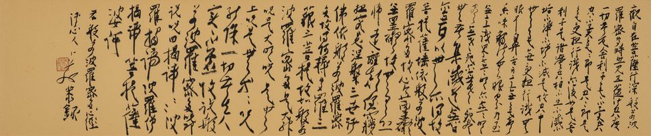 卜玆將寫經作為日課,透過反覆抄經,訓練專注力與內在穩定。寫經所積累的禪定,使他的草書在奔放揮灑之際得以掌控,不致失控飛散。細觀作品,線條俊中有秀,秀中帶鋒,展現卜兹書藝駕馭自如的動勢與力量感。此外,身為佛子的卜兹在本件行草中,仍維持相當程度的辨識性,恭敬虔誠之心一目了然。