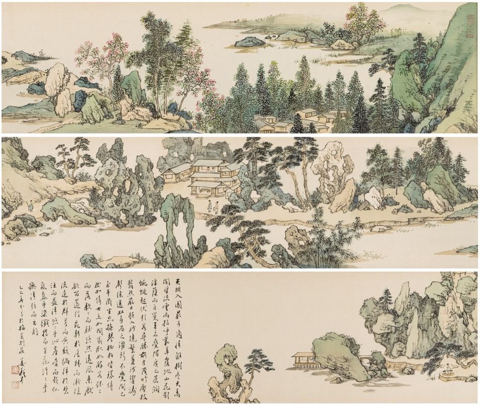 釋文:天朗入園,最可適情,雜樹參天,高閣望流雲而招呼;叢草覆地,山花對浮蔭而自笑。青石疊階,質已蒼潤,蜿蜒起伏,引客尋勝。前方茂竹壓枝,翳然蔽日,頓入妙境,繁葉沙響,濤聲徐送,雙耳為之濯新。不覺間已至平崗,坐望操琴,松柏皆環侍,曲如倚士,立如閑翁,臥如醉客,紛紛而落,款款而聽。倏然遠風來獻,欲留還行,宛轉於層林而漸徐,流連於群芳而愈馥,徜徉於碧汪而益清。悠悠乎沁塵骨而頓仙,氤氳乎染纎指而生花,泠泠乎撫清弦而出韵。