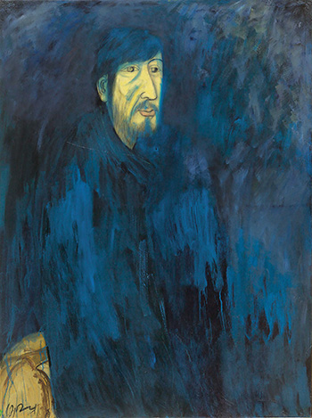 《猶豫》一作當中,可見邱亞才標誌性的藍色色調,他大膽地、猖狂地大筆觸塗抹於畫布之上,將形式拋諸腦後,以一種近乎表現主義的寫意風格描繪出男子飽含風霜、若有所思的神情,他對於人物情緒的獨特描繪多半來自於他長期坐在紫藤廬寫作時,對於熙來攘往的過客的深刻觀察,時而文人騷客、時而失意商人;抑或是拗執政治家、活躍的社運人士等等,勾勒出他對於這些主角細微的主觀陳述,猶如眾生相一般傳達出人物的神秘本質或是孤寂身影,更像是一種精神性的獨白,潛意識般地融入了藝術家的情感,造就了邱亞才於台灣當代藝壇的獨特身影與藝術成就。