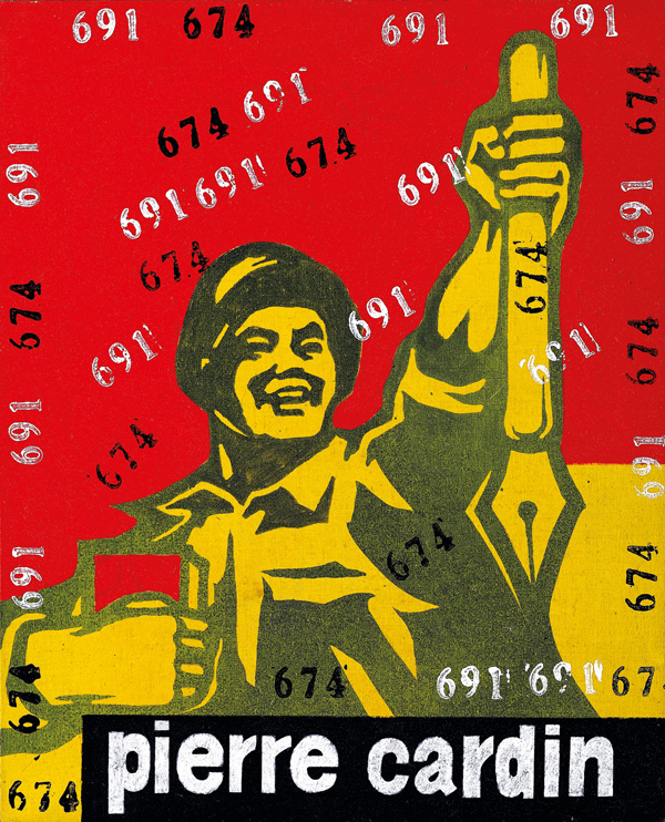 隨即,使我們驚訝的事實是,工人並非揮舞他本行業的工具。與拿著木槌或錘子相反,他一手舉著抄寫筆,另一隻手拿著一本不小的紅皮書。這一形象通過它緋紅色的背景得到加強,啞光黃和啞光綠的使用凸顯它做舊的質感。這幅作品蓋滿重複的如監獄犯人一般的身份編號。在畫面的底部,印著皮爾.卡登,這一標誌性的西方品牌,在2002年中國剛開放時這一品牌就深入人心,而這一年,這幅作品也剛完成。