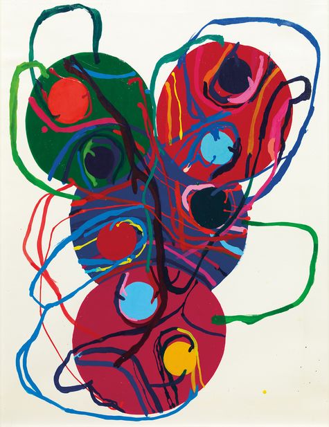 田中敦子的作品《02g》標誌其經典具特色性的創作風格,乃藝術家晚期貫徹終生藝術意志之作。飽和的五色波點圓圈,彼此緊密靠攏,細胞們融合交集,突破個體之分界;又像電子與正子互相碰撞泯滅,生成光子電流的瞬逝剎那。藝術家精深宏大的精神層次帶來能量,穿梭畫作的各個角落交織連結著錯綜複雜的虛擬空間。大小圓形聚合分散,亦或是內含其中,此因纏繞曲線連結成網。隱形流暢的力量震盪著觀者心智,因理性思辨而生的感性創作,探索宇宙乃至單一細胞千變萬化的未知性。田中敦子的畫作,背馳多數人選擇「空」的追求,回身包容現世以純粹抽象的表現,溫柔堅定地闡述「關係」二字在物質、精神世界所囊括的浩瀚可能。
