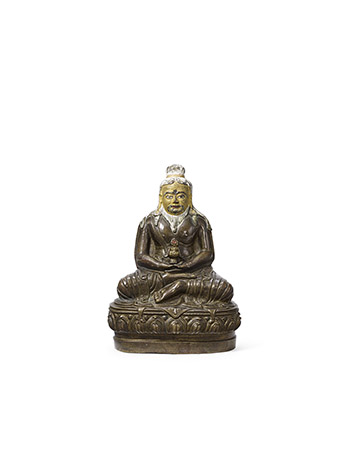 此造像以湯東傑布典型形象出現,刻畫為年邁的瑜伽士,上身赤裸,披掛瑜伽帶,以自在坐坐於蓮台上,雙手以禪定印捧寶瓶,代表其保佑長壽的功能。面部泥金,並於眉眼嘴唇畫彩,須髮塗以全白。湯東傑布身下蓮台上鋪覆一張鹿皮,代表其瑜伽士相應的果位,蓮台為單層仰蓮,蓮瓣雙卵形,這種蓮瓣最早出現於北印度地區,後世多有模仿,尤其是西藏東部地區。這件湯東傑布像為合金銅鑄造,皮殼經過幾百年歷史沉澱呈現出溫潤的棕色,整體比例協調,造型生動,尺寸恰為適宜陳設,是收藏賞玩的佳品。