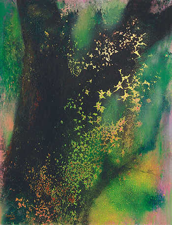 此幅《春晨曙光》,在黝深渾沌的背景中透出彷彿楓葉飄落之感,在抽象中帶有中國式的意境。尤其楓葉般的紋路,乃是從「張式技法」再開發出的「花葉紋」,乃是張淑芬目前抽象畫的代表題材之一。從「張式技法」一開始紋路迸裂的隨機性,演進到可控制為楓葉般的連續飄落之感,反映出她已經能完善地掌握顏料特性。黝黑背景的流動感,彷彿中國水墨的氤氳之感。然而以油性顏料畫出水墨的流動感,更映證目前張淑芬對於油性顏料的得心應手。