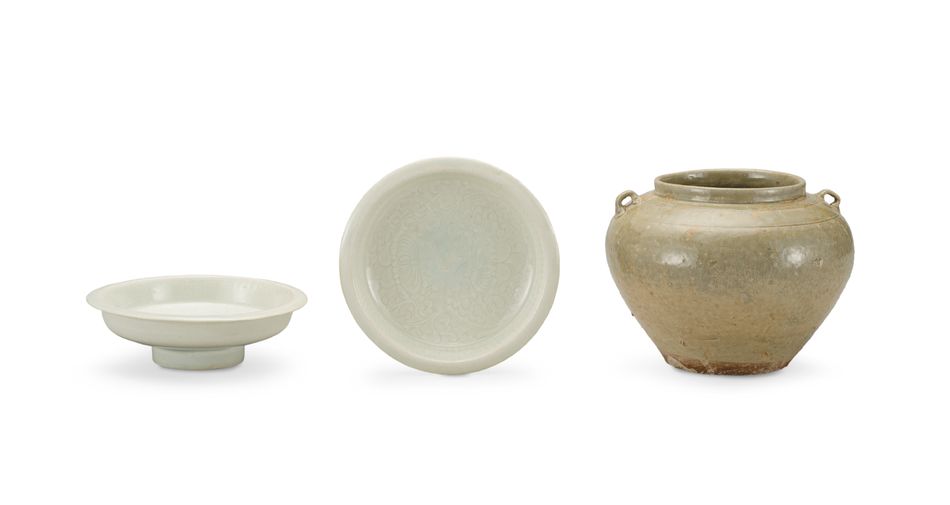 A Pair of Qingbai 'Peony' Dishes and A Yaozhou Celadon Handled Jar (A Set of Three)