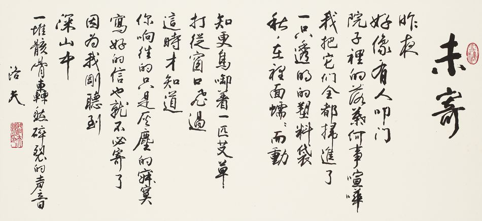 釋文:昨夜,好像有人叩門,院子裡的落葉何事喧嘩, 我把它們全都掃進了一只透明的塑料袋。秋,在裡面蠕蠕而動。知更鳥啣著一匹艾草,打從窗口飛過,這 時才知道,你嚮往的只是灰塵的寂寞,寫好的信也就不必寄了,因為我剛聽到深山中,一堆骸骨轟然碎裂的聲音。