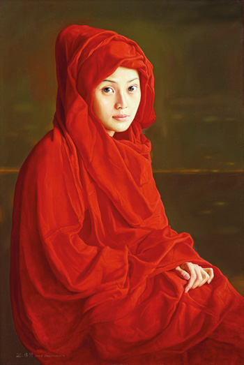 此嫻靜而擁有亮麗白皙容顏,身穿紅色長袍的少女不禁令人聯想起北方文藝復興時期聖母的形象。在中國,紅袍乃傳統婚嫁的象徵及於