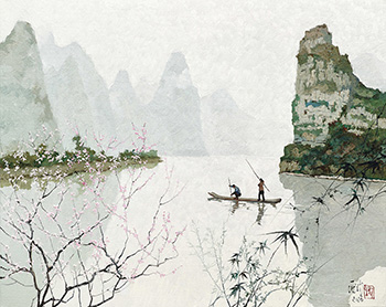 作品《灕江山色》完全表現出龎均在描繪山水上的才情。畫中前景枝枒新綠、春花初開,樹枝纖細交錯,含苞待放的淡粉色正是由此冒出,同時也象徵春天的降臨。從此處望去,水面無限展開直到與天色一致。創造出一片無垠的、深淺灰色調子的視覺幻象,讓觀者浮想連翩。水光瀲灩,映出附近山峰的倒影,讓人忍不住感嘆自然之美。中景一方扁舟掩掩映映,兩名漁夫平和地撐一支長篙,使得畫面在一片灰綠中生動起來,彷彿置身於青山綠水春花開的勝景中。龎均聰慧地吸取古今中外的繪畫優點,創建其油畫藝術的特質。