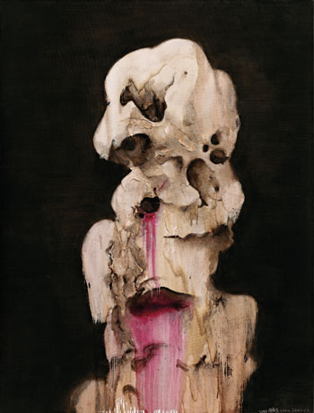 「石頭是中國歷代文人墨客表現的經久不衰的題材。石頭的體積和它表現的紋脈肌理,為藝術家提供了一個表現的機會。尤其是太湖石所呈現更為豐富、複雜。它圓滑的輪廓所形成含蓄而不失堅硬的人工化擺設的感覺,使藝術家可以不加修飾地形成一個完整的形象。太湖石又稱骷髏石,當我在畫它時,為了誇張石頭上的紅土,下意識畫成從洞裡流出的「血」。我沒有想那麼多。直到一次在四川美院辦講座,學生提出我的太湖石系列中有血腥、暴力的感覺。我發現了太湖石的魅力和它那矛盾的狀態與氣質。」