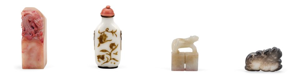 18/19世紀 各式鼻煙壺、玉瑞獸、白玉聯珠印及壽山石方章(八件一組)