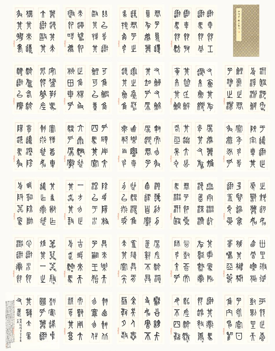 款識:師於一九八六年初春臨石鼓文第一通,一九八八年中秋前九日臨石鼓文第兩百通,一九八九年十二月八日完成石鼓文第三百通。盲猜推算,此冊臨竟約在一九八八年初春,或皆未能於公餘之暇致力臨石鼓文。師用功之勤,用力之深,非生所能望師項背。此冊筆畫多而結體完美者,如乙鼓「鱮」字、丙鼓「旛旛」字、丁鼓「鑾」字、壬鼓「驂」字,字字鮮活於用筆轉彎處,時圓時方;方而頑強者,適師之性也。己鼓第十一字,草之篆法與結體,天機自然,行筆中自有己意。當今書寫能得之於天機者幾希。此冊裝幀後有緣親睹敬讀,再三生之幸甚幸甚。靈渠館弟子李義弘拜記。二零一二年十一月。