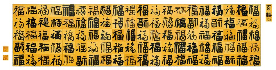 董陽孜的藝術奠基於西方美術教育,後融會貫通自幼臨摹書帖習字的訓練,將中國文字的字型提取出造形的態勢,以文字意義與畫幅構圖佈局出近似西方抽象畫的美感;董陽孜的作品既能巧妙地結合東西方文化脈絡,又結合書畫同源與平面造型的美學,形構出獨樹一格的書法風格。此幅《百福》為董陽孜作於2005年的作品,自1998年開始,董陽孜以「一同享福」的深切祝願,每年歲末為世人寫下一百個福字,以各個姿態丰貌的碑帖書體寫於純手工渲染的金宣紙上,將傳統文人的書法藝術融於現代人文的生活之中。《百福》文字書體結合了沉著穩重的楷書、從容多 變的隸書、嚴正緩筆的篆書及行雲流水的行草體等書體, 書藝除了展現其深厚的功法底蘊之外,更蘊含書者自身的 修為與品性涵養,《百福》以巨幅三摺四面屏風的形式表現了董陽孜對古代冊頁形式的追尋,讓沉穩的墨色在華貴的金宣紙上形構出書畫合一、如詩悠然的畫境,實為難得罕見的代表巨作。