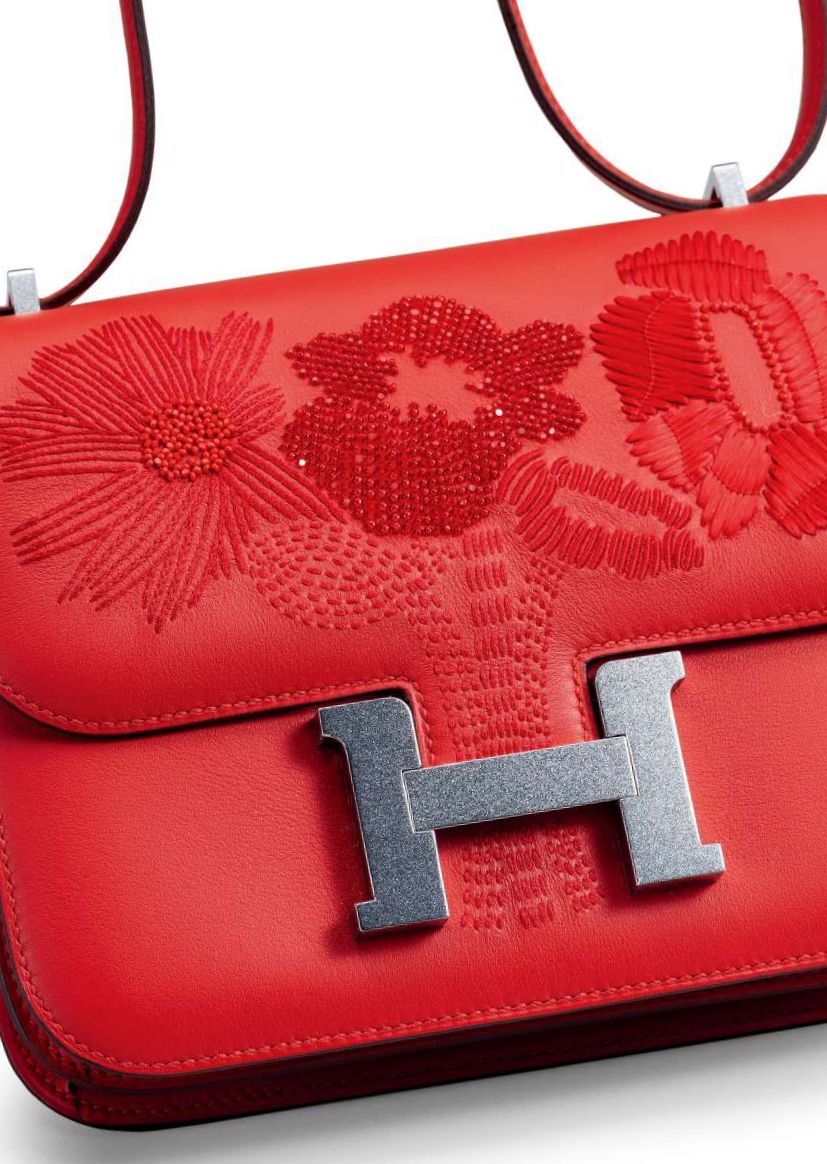 限量款愛心紅色SWIFT牛皮串珠刺繡跳舞花18公分迷你CONSTANCE包附銀色金屬配件