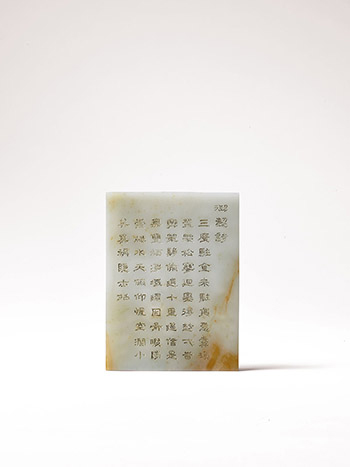 A greenish-white jade rectangular table screen with partial brown spots and carvings on both sides. The front features a relief of a vast landscape of towering mountains, amongst which are several traditional pavilions. A winding path alludes to the poetic imagery of A thousand hills, but no birds in flight; Ten thousand paths, with no persons in sight. The back features a gold foil engraving of an imperial poem, Living amongst riches did not bring peace, so I retreated to Song Liao Mountain to live a hermit's life. A period of solitude brings joy to the mind, thus I plan to ride my horse to a far away place. Here, with its crisp and clear waters, is like no other place on earth. Vast nature stretch beyond, inviting me to live within her in solitude. The calligraphic work is of a orderly and flamboyant style, evoking a temperament of dignity.