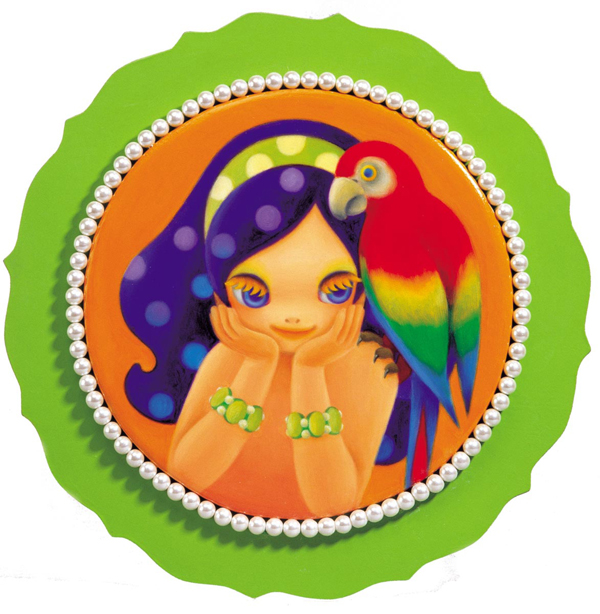 櫻井理惠子,遊走在工藝性與創作之間,作品常甜美地描繪女孩和動物,似在陳述這兩種元素才能達到的美麗境界,女孩絲絨般的肌膚、幼稚的裝扮,卻在她深不可測的眼神成為觀者佇足思索的理由,明亮的用色是否在掩飾些什麼?《鳥與女孩》中的鳥,或許鳥的國度才是女孩心中的桃花源。