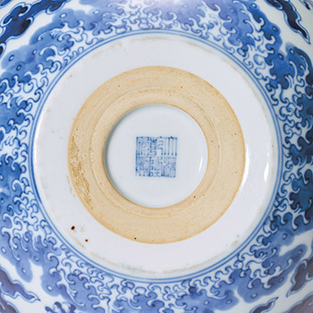 The jug has a wide opening and a curved belly that gradually narrows onto a concave bottom. It is decorated with a glazed blue and white pattern across the entire body. On the wall beneath the rim and near the foot are two circles of fine bow string patterns with an extra circle of roaring wave pattern on the bottom. On the wall of the belly are two dragons chasing each other amid clouds of fire, with one looking over its shoulder, and one ready to soar. The two creatures stare at one another intensely, baring their teeth and swinging their claws, looking bold and powerful. On the bottom, six characters, Made in the Qianlong Period of the Qing Dynasty, written in seal script.