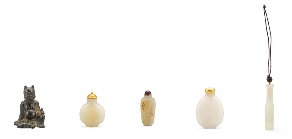 18/19世紀 銅人物坐像、白玉鼻煙壺及白玉煙嘴(五件一組)