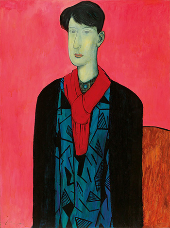 邱亞才的人生故事書中,有著尋常的庶民百態,亦有他生前結交許多的藝壇或文壇好友,而這些靈感來源與他過往深刻的人生歷練相互揉合;他飽讀經典文學卻不咬文嚼字、他提筆繪畫卻不流於空有的形式主義,使得他的創作多了一分質樸親切的溫暖質地,更加地揉進觀者的生活使之感動;邱亞才創作生涯的中後時期約90年代起,可以見卓他風格與用色上的轉變;此時期的人物創作多半打扮較為入時,而在人物的刻畫描繪上亦可看出此時期的線條較為流暢,少了幾分滄桑筆觸,卻多了幾分翩翩詩意;此件創作於1998年的作品,《紅圍巾青年》同時可看出宋代文人肖像畫對於藝術家的影響;細條的臉部線條與細緻的五官描寫帶有清新亮麗的質感,與早期晦暗、陰鬱、充滿苦悶暴躁氣息的作品大相逕庭,特異卻帶有神秘、不流於俗套的優雅文人繪畫風格儼然流瀉而生。