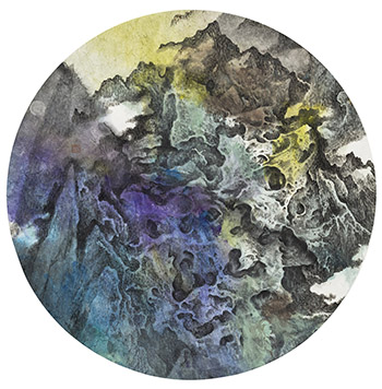 如一,生於北京,自幼喜歡繪畫,研習水墨畫逾30年。近年專攻奇石、雅石的繪畫表現。此幅《天地玄黃之二》較之前「奇石」系列,更顯水墨「石如雲動」之韻致。「天地玄黃,宇宙洪荒」為《千字文》始句,「天地玄黃」出自《易經》。講天地宇宙未生之前,一片混沌狀態。作品細膩墨線與骨法用筆,畫出奇石的骨骼與凸凹有致的質感,畫石之作,在他筆下,石既堅實沉穩如山,又如煙似幻而渺遠。如同董其昌所言的「下筆如有凸凹之形」,在如一筆下得到了徹底實現,婉轉用筆中既有石頭肌理的凸凹感,又有墨色的細微變化,堅硬如鐵又細如牛毛,還有奇石本身洞孔的留白與灰色背景上的對比,給畫面帶來了更為生動的變化。他說「自己專注於石畫,所到之處、所見山石都內化成胸中丘壑,縮微在紙上,呈現的是文人畫脈。」