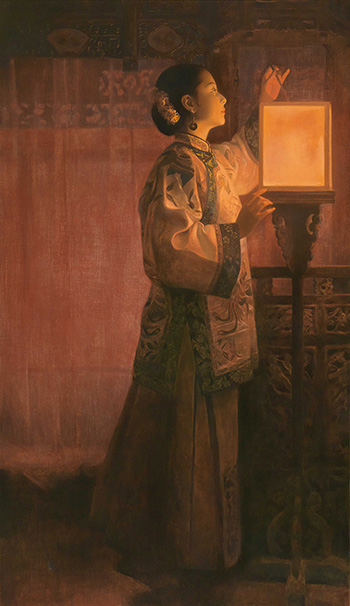 Signed on the reverse Zhu Yiyong, titled Mid-Autumn Night in Chinese, inscribed 77 x 135 cm