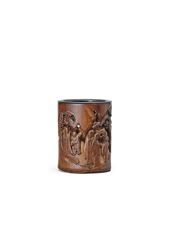 Held up by three short legs, this bamboo carving possesses a round opening and a cylindrical abdominal. The rim is inlaid with a ring of rosewood. The literary pictures on the outer wall were carved by integrating the techniques of openwork and incision. An openwork technique is used to construct the appearance of a rocky mountain. With the full use of openwork, the outer appearance seems to possess a sense of visual penetration. Close-up, towering pines offset the ease of green peaks, and we are able to see a gathering of elegant women. Wearing graceful clothing, the noble people bear a sense of casual elegance. On the side, a child servant holds a string instrument whilst following them closely. The poetic scene of a cultured gathering plays out amongst a melody of clear strings.