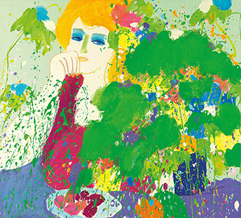 此件畫作完成於丁雄泉旅居紐約的壯年時期,抑是藝術家飽含創作力,融合他過去與當時所見所聞如:眼鏡蛇派、抽象表現主義、普普藝術等的成熟年代;亦正是在這時期,藝術家獨特的藝術語彙一步一步的成形,他琢磨本身的中華文化底蘊,亦同時不斷汲取當時西方藝術潮流中最令人激賞讚嘆的精華,淬煉成藝術家最具代表性的表現主義風格;在此件色彩斑斕的《與我喝杯茶》中,藝術家大膽的用色直覺與感性的色彩碰撞,讓畫面鋪陳出一股熱鬧歡愉的氛圍;丁雄泉流暢的筆法線條勾勒出畫中美女的綽約姿態,神情泰若宜人,慵懶地手臂伏案、眼神從容面帶一抹含羞的微笑,與多以裸女之姿為主題的其他畫作相比,此件佳作則披上了一股神秘卻又優雅的面紗;丁雄泉同樣愛花、畫花,他以抽象表現主義的骨架,揮灑出盛開嬌豔的盤花朵朵,展現出生命力的豐美與對美的事物的執著熱愛,而桌上看似嬌鮮欲滴的水果錦集與青春貌美的畫中女子相呼應,帶出了青春無限的美好氣息。