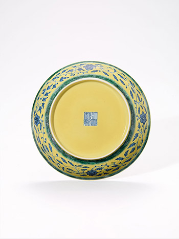 黃地青花是一種結合釉上釉下的彩瓷,其製作工藝是先高溫燒成青花瓷,再於白地之處填施黃彩,最後於850度至900度之間的低溫烘烤而成。在眾多精美的單色釉中,黃釉是皇室控制最嚴格的一種釉色,因為「黃」與「皇」同音,以致明、清兩代的黃釉瓷器只允皇家才能使用,不能隨便僭越。