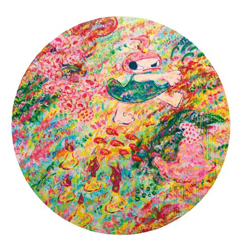 2019年是六角彩子拍賣市場豐盛的一年。無論是交易量,亦或藝術家整體平均價格,該年度都是以一飛沖天的態勢竄升。從歐洲紅回亞洲,二手交易市場集中在台北、東京、香港,足以了然亞洲藏家對六角彩子的喜愛與重視。同年,六角彩子創作《圓形花園》直徑達一米三,畫面繽紛斑斕,另人目不暇給。如此巨大的圓型畫作,拍賣場上甚為少見。別於藝術家早期畫於瓦楞紙,單一人物特寫的構圖。《圓形花園》的背景精緻繁密,如同春日蘇格蘭荒野,乘著風沐浴暖陽,無邊無際的草嶺野花欣欣向榮。右上方小女孩頂著俏皮馬尾,身穿綠底花洋裝,踢著正步向前,還不忘瞪眼瞧瞧身後爬行的小怪獸,活脫脫調皮可愛的樣子,正是藝術家畫作最代表性的特徵。作品透過藝術家的雙手,蘊含著勇敢、自信與生命力的信念。紛擾的日常中,六角彩子的純真正向,照亮你我生活,使心中充滿歡笑與喜悅。