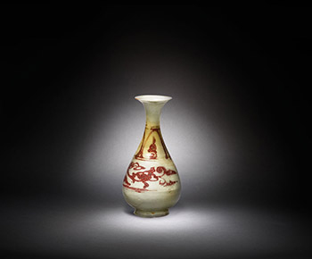 釉裡紅是元代景德鎮窯新創燒的品種,主要以氧化銅為著色彩料,然後施透明釉於高溫下燒成。不過由於氧化銅的窯爐氣氛不好控制,因此元代釉裡紅的發色不是泛黑,就是多有「飛紅」現象,惟本件釉裡紅釉色紅艷而且紋飾尚稱清晰,故在元代釉裡紅瓷器中,實屬難能可貴。